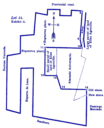 The third assignment of error relates to the exclusion of "un paso de unos tres metros de ancho" along the lines 8, 9, 10, 11, and 12 of said plan Exhibit G. The lower court found from the evidence that a preponderance of the same clearly showed the existence of said "callejon" or road. After a careful examination of the evidence adduced pro and con, we are convinced that the lower court made a careful estimation of the same. An examination of the record discloses that there existed from time immemorial between the lands of the petitioners and the adjoining lands from points 8 to 12 of lot No. 24, a passage both for pedestrians and vehicles; that said passage formed the boundary line between the property of the petitioners and that of Anastasio Aniversario and Elias Agoncillo; that its width was about three meters; that there existed many signs of the existence of said "callejon," for example, camanchile trees are found on both sides of the same, as well as plants known as "reymoras." See declarations of Elias Agoncillo, Mariano Admana, Pedro Espinosa, and Domingo Mercado. Plan Exhibit G was prepared and presented by the petitioners. An examination of that plan discloses that the "callejon" in question is therein represented; that the west side of said "callejon" from points 8 to 10 is represented by the black lines between points 8, 9, and 10, while the east side is represented by a dotted line running parallel with the first, beginning from an unmarked point east of point 8 and ending at an unmarked point southeast of point 10; that the north side of the "callejon" between points 10 and 11 is represented by the black line between said two points, while the south side is represented by a dotted line beginning from an unmarked point southeast of point 10 and ending at an unmarked point south of point 11. The plaintiffs admit that one of said "reymoras" plants is located 3 meters north of point 11. The surveyor who prepared plan Exhibit G established the line marking the boundaries of the "callejon" by using the trees and plants above mentioned as a guide. In our opinion the evidence produced by the petitioners on the trial is not sufficient to show that said "callejon" was a part of lot No. 24. The existence of the "callejon" was established by the declaration of several witnesses. The title deeds presented by the petitioners failed to show that their lands covered said "paso de unos tres metros de ancho." The evidence adduced fails to show by a preponderance that the petitioners were the owners of the land covered or occupied by said "callejon."