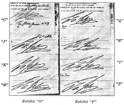 An examination of the nine questioned signatures shows that in six of them (Exhibit K, front; Exhibit J, front and back; Exhibit M, front; Exhibit N, front and back) the second down stroke of F intersects the first down stroke at a point to the right of the beginning of the first down stroke projects to the rights of the second down stroke, in some case forming a noticeable acute angle (Exhibits M, J, and K), while in the remaining three questioned signatures the second down stroke is written partly over the first down stroke (Exhibits C, L, and M, front). The dissimilarity of the questioned and unquestioned signatures in this respect is clearly shown by a comparison of the enlargements, Exhibit P (unquestioned) and Exhibit O (questioned).