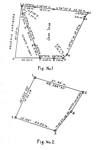 The situation of the land in question may be best understood by a reference to the sketch, fig. 1. The portion lying within the points 1, 2, 3, 4, 5, 6, 7, 8, 9 and 10 of the sketch is high land and the undisputed property of the appellant Insa. The triangular portion lying within the points 1, 10, 9, 8, 7 and 11 is in dispute and is low grass land. The adjoining land to the west of the line 1-11 and to the south of the line 7-11 in the undisputed property of the appellee Enriquez and is low land of the same general character as the disputed portion. Points Nos. 1, 2, 5 and 7 are marked with very old monuments of adobe stone and points Nos. 9 and 10 are marked with old Bureau of Lands monuments probably placed there at the time of the land registration surveys in the year 1904. Most of the other points are marked with new Bureau of Lands monuments. There is no monument of any kind at point No. 11. The line 1-10-9-8-7 is also indicated in the field by a continuous row of heavy bamboo along the entire length of the line.