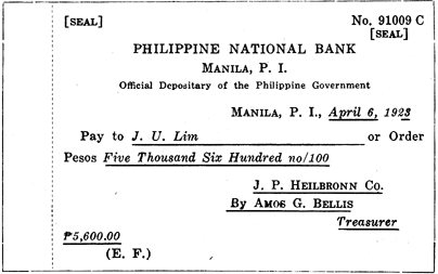 April 3, 1923, an application for a book of checks Nos. 91001-C to 91150-C was received by the Philippine National Bank, with the purported signature of the firm of "J. P. Heilbronn Co., By Amos G. Bellis, Treasurer." Apparently the bank issued the check book as requested. April 5th, 6th, and 12th, the defendant presented the checks, known in the record as Exhibits A, B, and C, Nos. 91007, 91009, 91011, respectively, to the Philippine National Bank for payment. They were drawn payable to the order of J. U. Lim, and upon their face purported to have been drawn and signed by Amos G. Bellis, Treasurer of J. P. Heilbronn Co. They were all cashed by, and the money paid to, the defendant by one of the paying tellers of the bank. The signature, appearing upon each of the checks of the drawer, was a forgery, although it purported to be, upon its face, the genuine signature of Amos G. Bellis, the treasurer of the company.