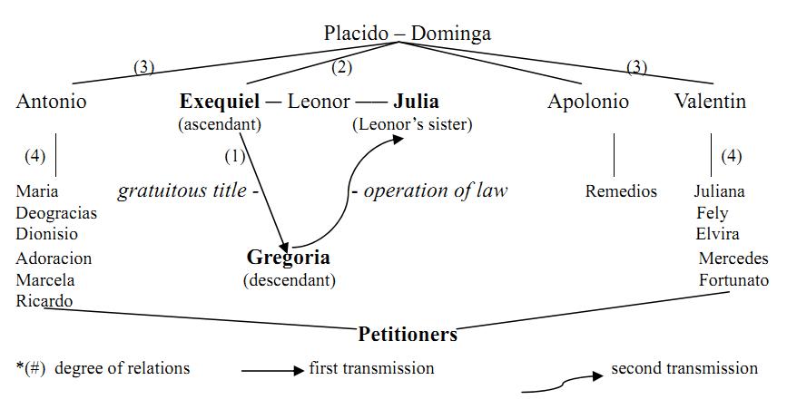 Gregoria’s ascendants are her parents, Exequiel and Leonor, her grandparents, great-grandparents and so on. On the other hand, Gregoria’s descendants, if she had one, would be her children, grandchildren and great-grandchildren. Not being Gregoria’s ascendants, both petitioners and Julia, therefore, are her collateral relatives. In determining the collateral line of relationship, ascent is made to the common ancestor and then descent to the relative from whom the computation is made. In the case of Julia’s collateral relationship with Gregoria, ascent is to be made from Gregoria to her mother Leonor (one line/degree), then to the common ancestor, that is, Julia and Leonor’s parents (second line/degree), and then descent to Julia, her aunt (third line/degree). Thus, Julia is Gregoria’s collateral relative within the third degree and not her ascendant.