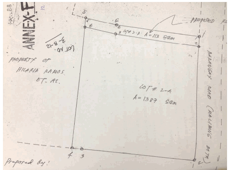 Figure 1. Drawing13 showing the location of petitioner’s and respondents’ properties in relation to the proposed easement. Petitioner’s property is located on the leftmost part of the drawing. Respondents’ property and the proposed 113-square-meter easement are located on the drawing’s right side that contains petitioner’s property. Barangay Malibong Bata Road can be seen on the rightmost part of the drawing.