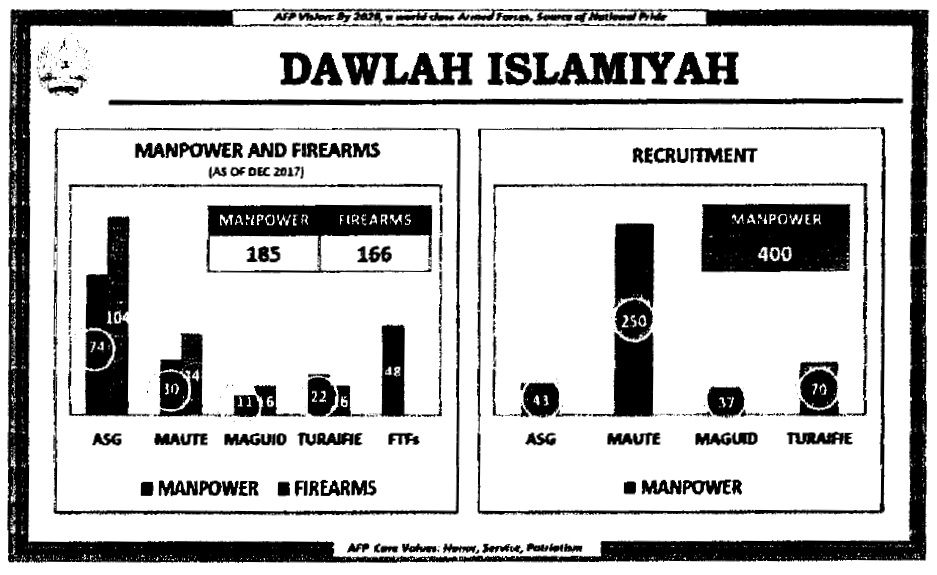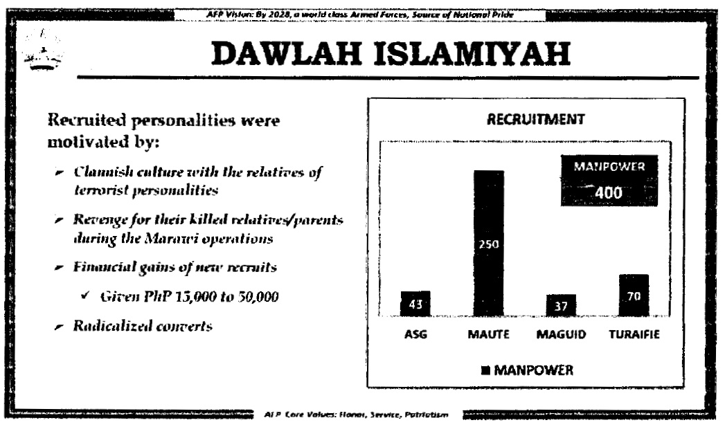 More specifically, the remnants of DAESH-inspired DIWM members and their allies, together with their protectors, supporters, and sympathizers, have been monitored in their continued efforts towards the radicalization/recruitment, financial and logistical buildup, as well as in their consolidation/reorganization in Central Mindanao, particularly in the provinces of Maguindanao and North Cotabato and also in Sulu and Basilan. These activities are geared towards the conduct of intensified atrocities and armed public uprisings in support of their objective of establishing the foundation of a global Islamic caliphate and a Wilayat not only in the Philippines but also in the whole of Southeast Asia.