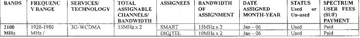 According to the National Telecommunications Commission, the following were the assigned and vacant 3G frequencies as of 2017:68